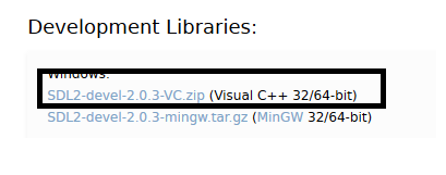 So, we start by getting a hold of the SDL2 development libraries from libsdl.org. You should choose the Visual Studio version listed: