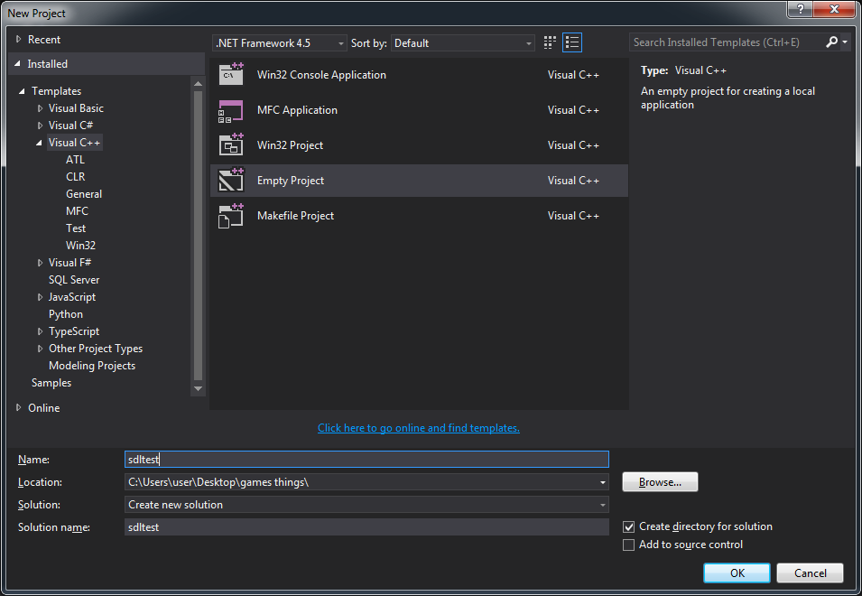 First, create an empty project, calling it whatever you want (I’ve called mine sdltest)