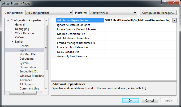 Next, go to Linker > Input and click in the Additional Dependencies field.