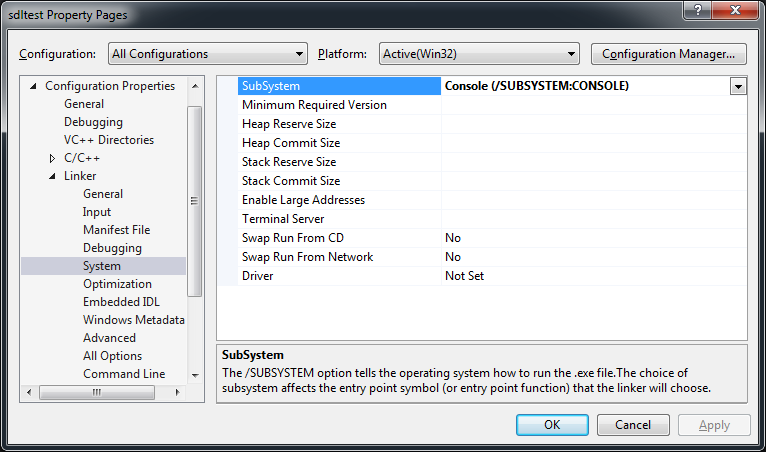 Select Console(/SUBSYSTEM:CONSOLE) from under the SubSystem heading. This is to ensure that it shows a console you can print debug messages to as unlike Linux, you may not necessarily be launching these things from the terminal. All of this is now set up, so now we write a test program to see if it installed successfully: