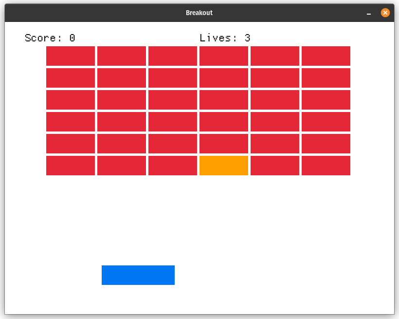 Running lesson 3 gives us something that resembles Breakout – we have the ball bouncing around, hitting bricks and destroying them but when the ball hits the bottom, it just bounces off.